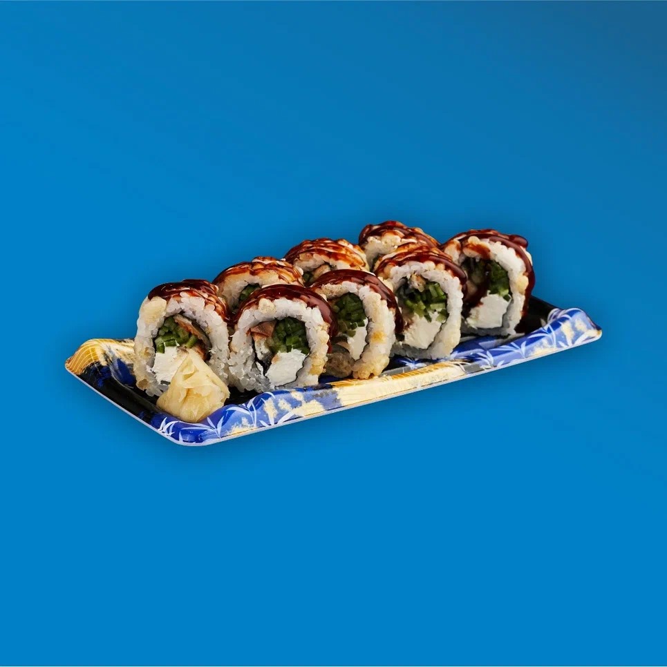 Рис, нори, сливочный сыр, угорь копчёный, огурец, темпура, унаги соус.