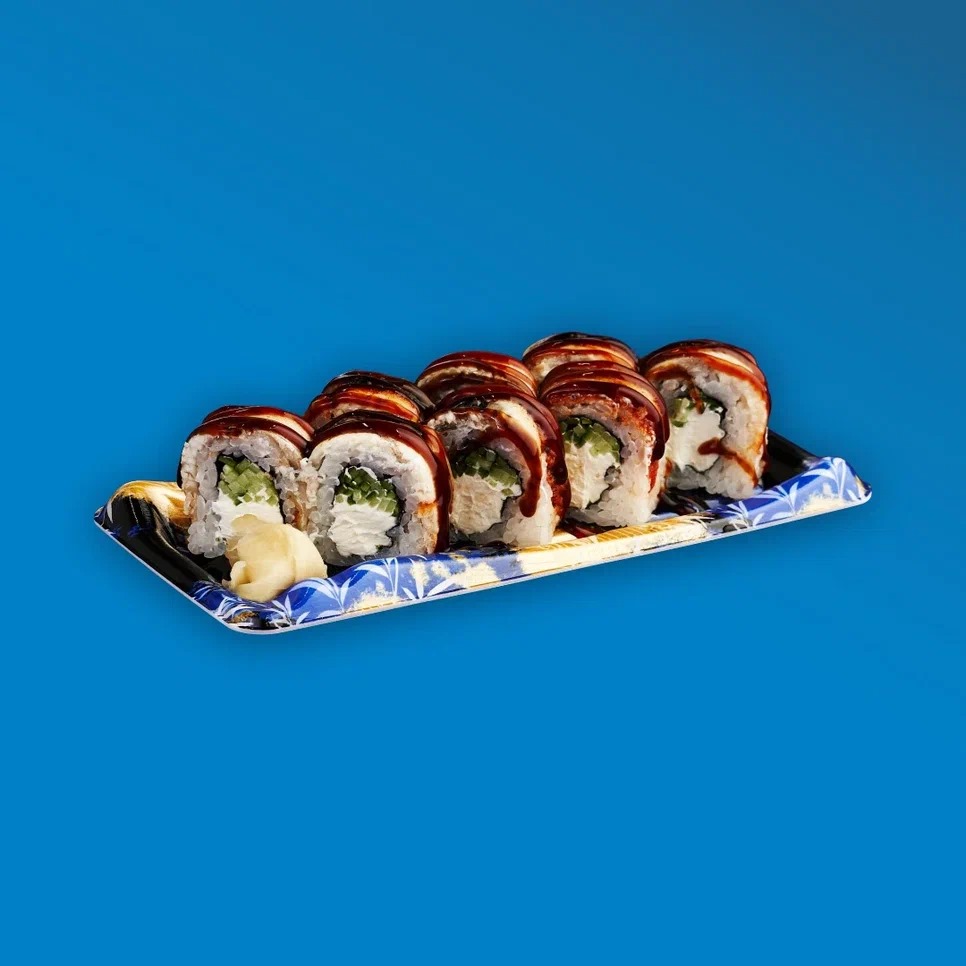 Рис, нори, сливочный сыр, огурец, копчёный угорь, унаги соус.