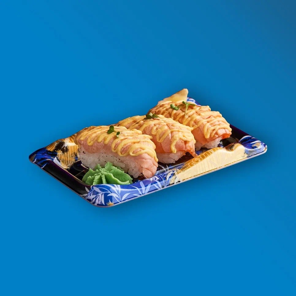 Суши с опалённым лососем (3 шт), сырный соус, унаги соус, микрозелень.